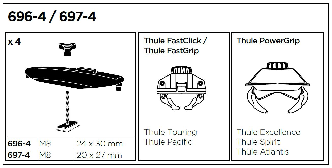 | TH696-4 | M8 | 24 x 30 mm | FastClick / FastGrip / PowerGrip rendszerekhez | Thule Excellence / Touring / Pacific / Spirit / Atlantis tetőboxokhoz |