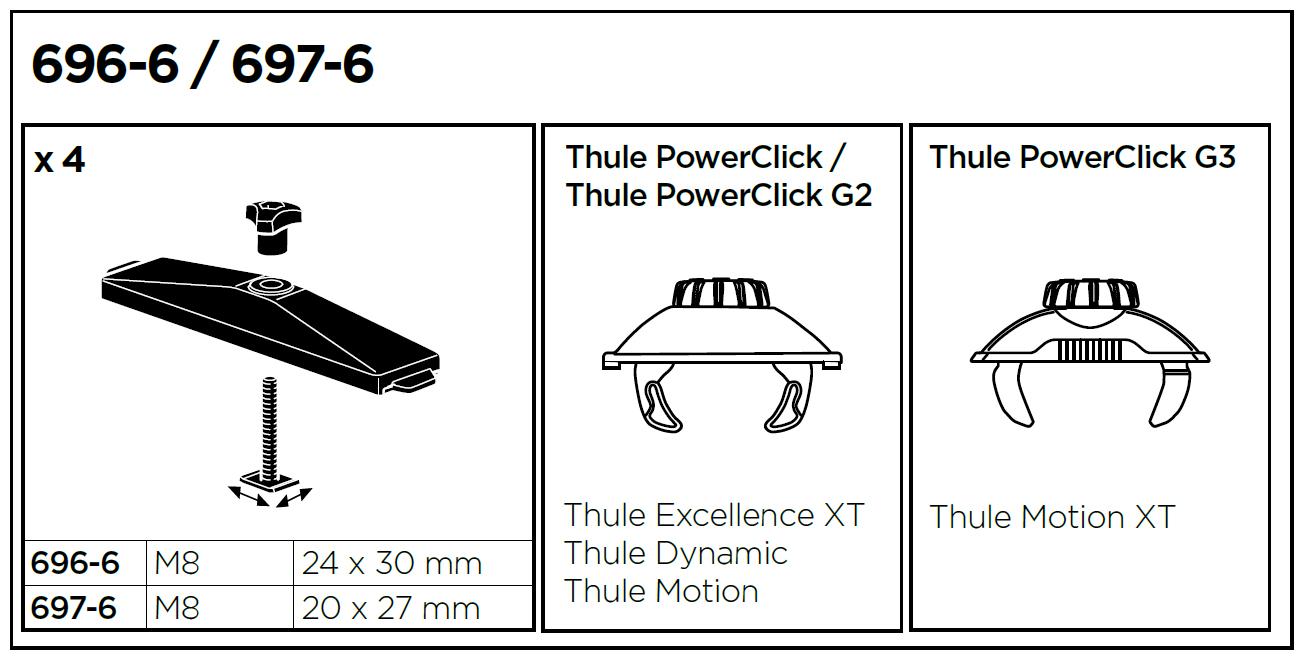 | TH696-6 | M8 | 24 x 30 mm | PowerClick rendszerekhez | Thule Excellence XT / Excellence / Dynamic / Motion tetőboxokhoz |